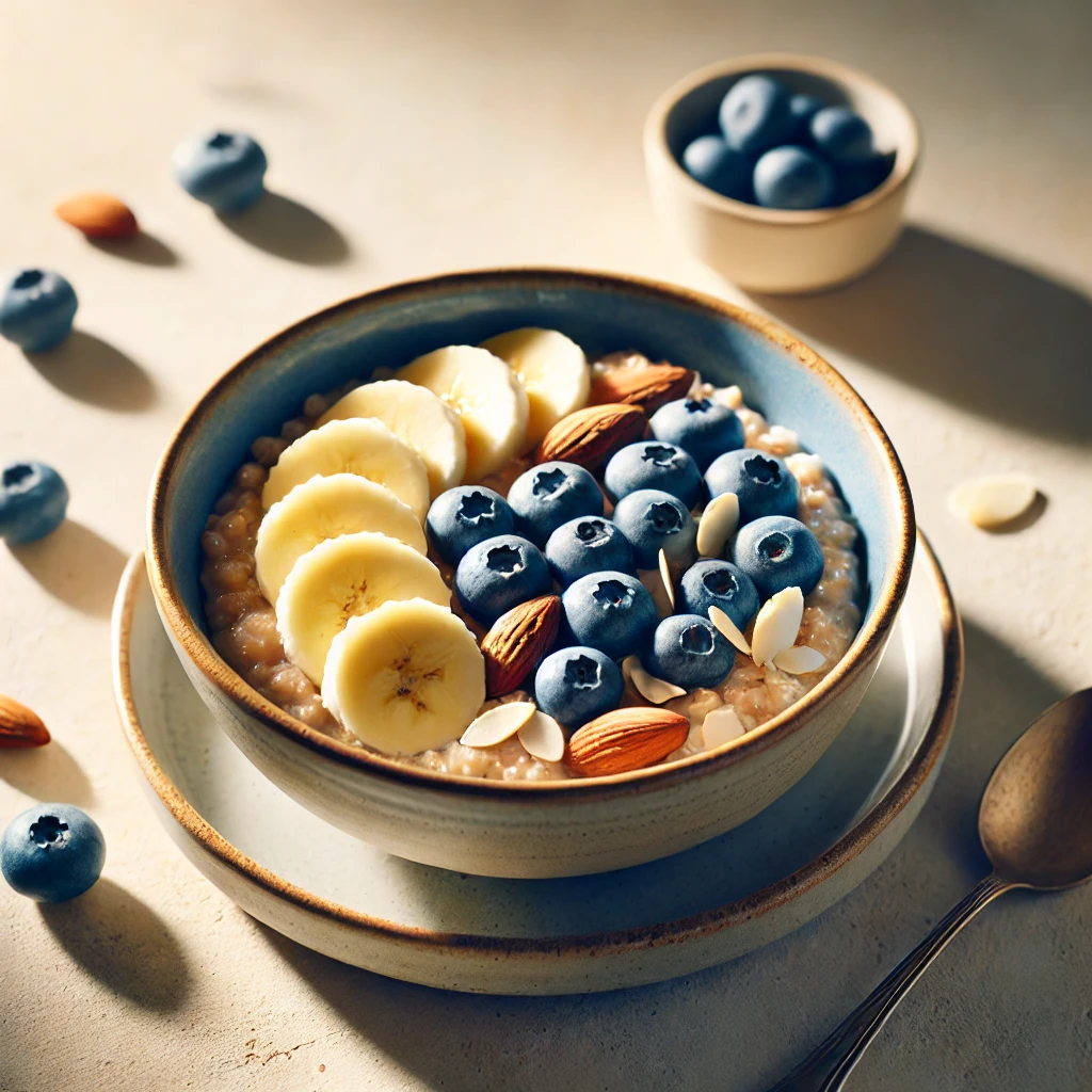 - 오트밀을 그릇에 담고, 바나나와 베리류, 견과류를 얹어주세요.